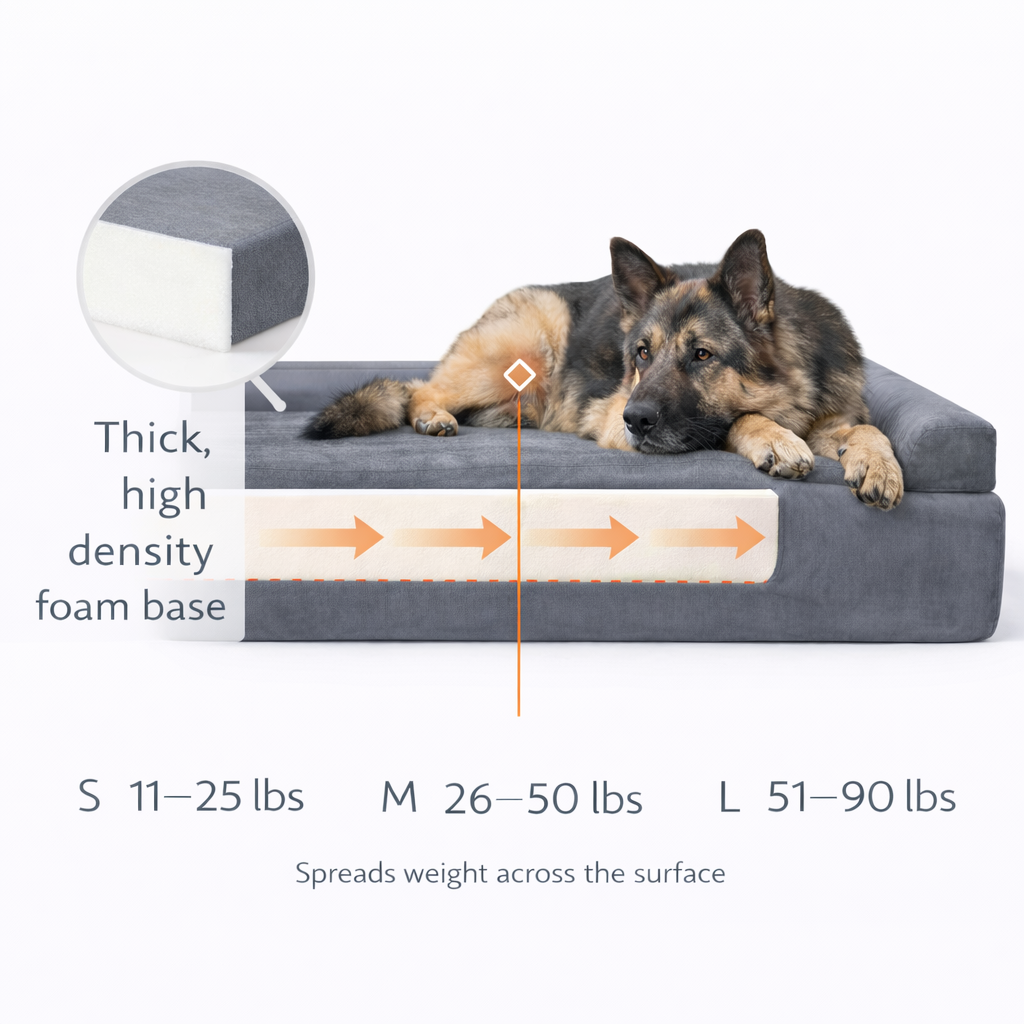 Thick, high density foam base helps protect joints from hard floor pressure for heavy dogs.